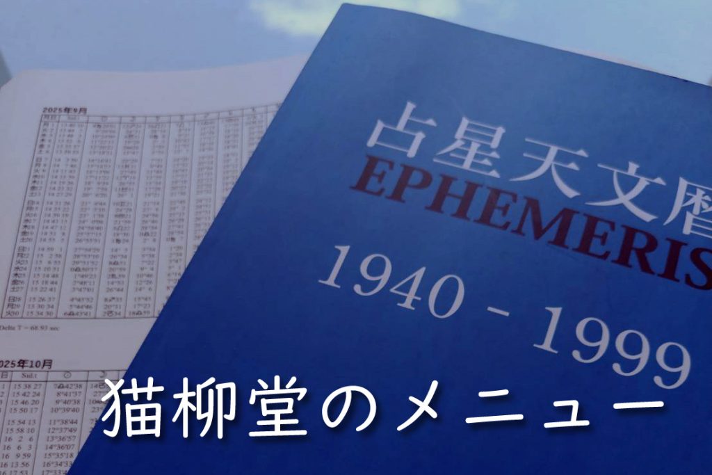 星詠みの猫柳堂 2024.08.042026.01.09 ようこそ、心理占星術の世界へ。性格、心理、人生の目的・・・。月と太陽そのほかの星たちが、あなたのこれから歩む道を明るく照らしてくれます。今の環境をさらにあなたらしく、生きてみませんか?猫柳堂がお手伝いさせて頂きます。